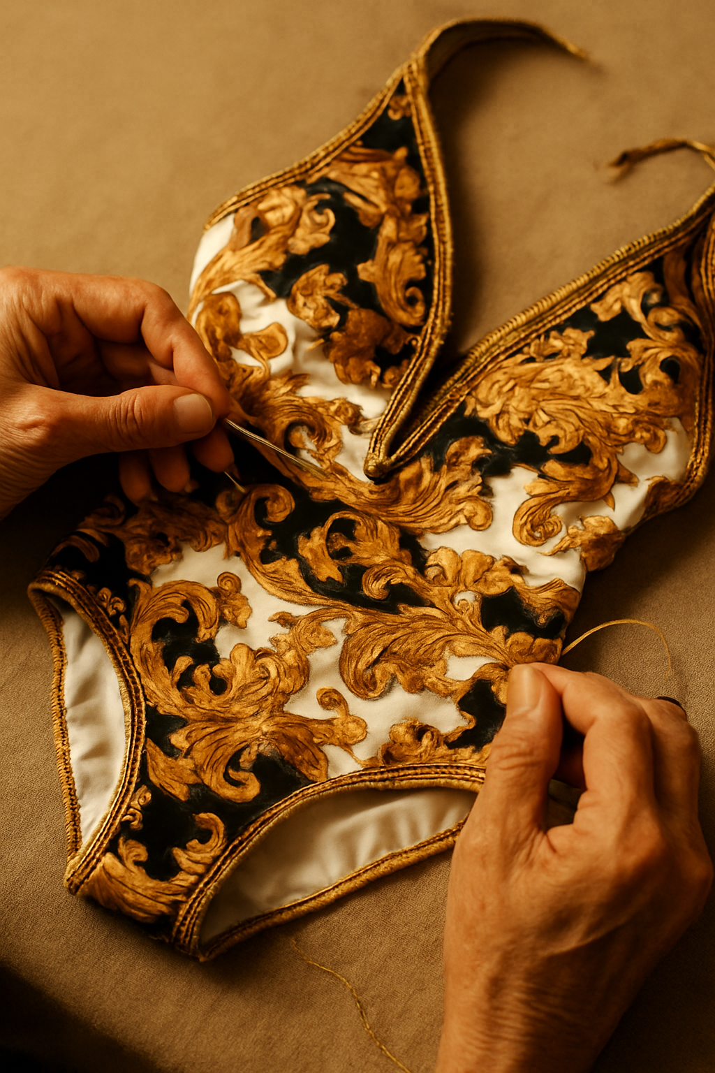 "Each swimsuit carries the soul of craftsmanship: delicate handmade embroidery, seams of ultra-quality, and the devotion of those who weave not only fabrics, but stories of resilience and beauty"